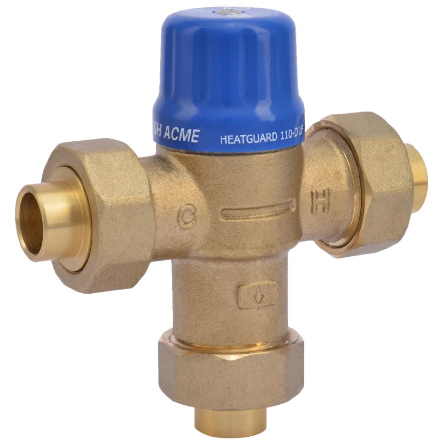 A thermostatic mixing valve can be installed at the water heater or any fixture to distribute controlled temperature water through a domestic hot water system. The valve allows the water heater to be set at a germ-killing 140°F (49°C).