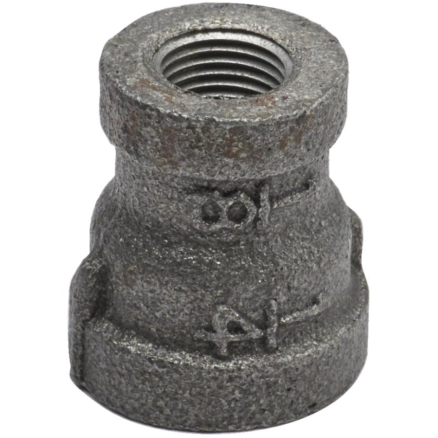 Use reducing coupling to connect two pipes with different diameters that are flowing in the same direction. This black pipe fitting has two threaded female ends measuring 1/4” and 1/8”. Connect with two male pipes to create a tight seal.
