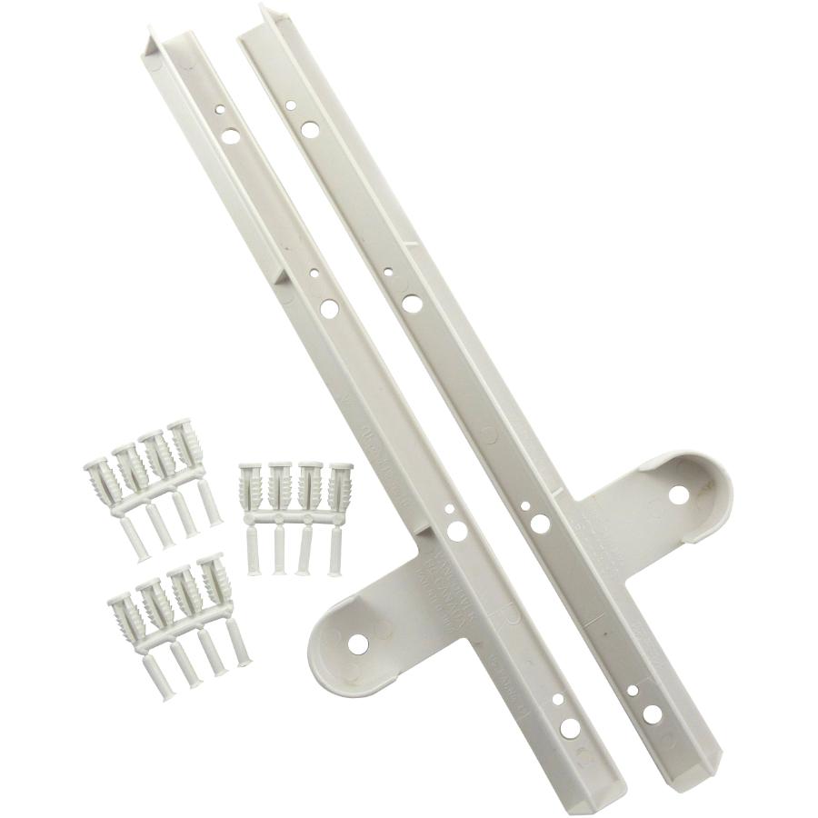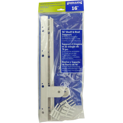 Colour Family: WHITE Material: PLASTIC Assembled Product Length: 16" . To be used with standard 5/8" or 3/4" x 16" deep shelves • Manufactured from strong, easy to clean ABS plastic • Simply install directly into drywall or wood • No location of studs required • Designed to support over 300lbs when installed with the included anchors and pins • Anchors and pins are concealed when shelf is installed to provide a clean custom appearance • White • 1 pair • DIMENSIONS: 16"