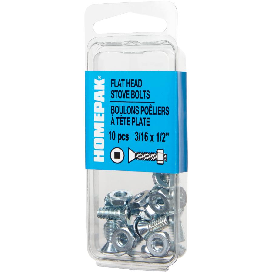 Material: ZINC PLATED STEEL Assembled Product Length: 0.5" Fastener Drive Type: ROBERTSON Assembled Product Height: 0.19" Assembled Product Width: 0.19" Fastener Diameter (Imperial): 0.19" Fastener Length (Imperial): 0.5" Fastener Length (Metric): 12.7 MM Fastener Diameter (Metric): 4.83 MM . Flat head • With hex nuts • Bright zinc plated • Used to fasten metal to metal, metal to wood and other types of materials, with machine tapped threads or nuts, where disassembly may be required or where a more secure clamping of parts is desired