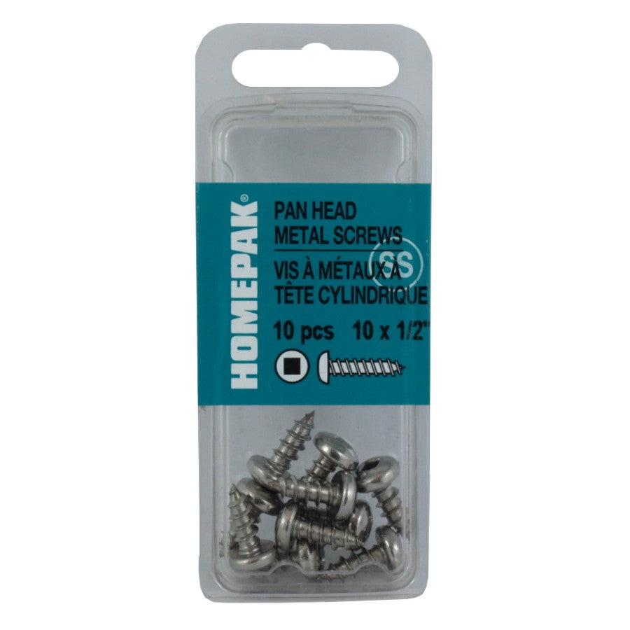 Material: STAINLESS STEEL Assembled Product Length: 0.5" Fastener Drive Type: ROBERTSON Finish: N/A Fastener Diameter (Imperial): #10 Fastener Length (Imperial): 0.5" . Sheet metal screws • Stainless Steel • Pan head socket