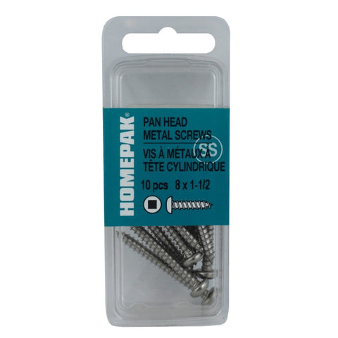 Material: STAINLESS STEEL Assembled Product Length: 1.5" Fastener Drive Type: ROBERTSON Finish: N/A Fastener Diameter (Imperial): #8 Fastener Length (Imperial): 1.5" . Sheet metal screws • Stainless Steel • Pan head socket