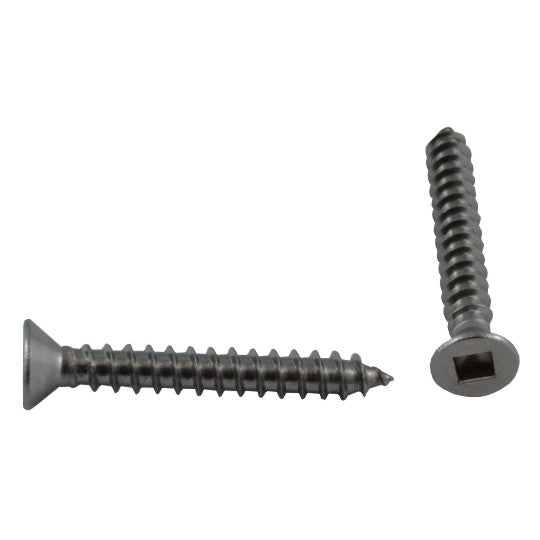 Material: STAINLESS STEEL Assembled Product Length: 1.25" Fastener Drive Type: ROBERTSON Finish: N/A Fastener Diameter (Imperial): #8 Fastener Length (Imperial): 1.25" . 18.8 Stainless steel • Flat head • Square socket drive