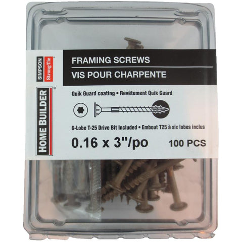 Assembled Product Length: 3" Fastener Drive Type: TORX Fastener Diameter (Imperial): 0.16" Fastener Length (Imperial): 3" . The larger head with underhead box-nibs provides increased bearing in structural applications and provides clean and easy countersinking. SawTooth type-17 tip for quick starts with no pre- drilling. Serrated threads reduce installation torque for easier driving. The 6-lobe drive reduces driver-bit cam-outs, resulting in easier installations and longer bit life. Quik Guardcoating provides protection in indoor and outdoor applications. Multipurpose wood-to-wood applications including framing. 100 pack