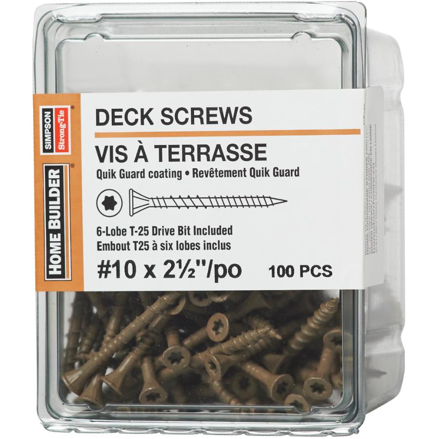Colour Family: BROWN Assembled Product Length: 2.5" Fastener Drive Type: TORX Fastener Diameter (Imperial): #10 Fastener Length (Imperial): 2.5" . Low-torque threads allows more screws to be driven on a battery charge • Ribbed head design countersinks easily and provides a clean, finished appearance • High-low tip provides fast starts • Optimized threads for dimensional lumber • Quik Guardcoating provides corrosion resistance for exterior and certain preservative-treated wood applications • Tan colour blends in with most woods • 100 pack • INCLUDES: T-25 6-lobe driver bit