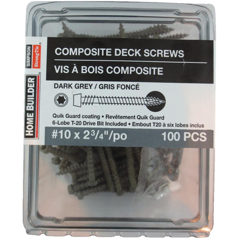 Colour Family: GREY Assembled Product Length: 2.75" Fastener Drive Type: TORX Fastener Diameter (Imperial): #10 Fastener Length (Imperial): 2.75" . Tri-lobe thread design reduces damage to the composite board while driving • Inverted upper threads clear excess material to ensure the screw is seated properly and consistently • Double-cut point penetrates composite-decking with ease for faster starts • Cap-head prevents mushrooming and material from rising up above the deck for a smoother, clean-looking installation • Ideal for fastening composite decking boards • Approved fastener (by Trex for Trexcomposite decking • Grey • 100 pack