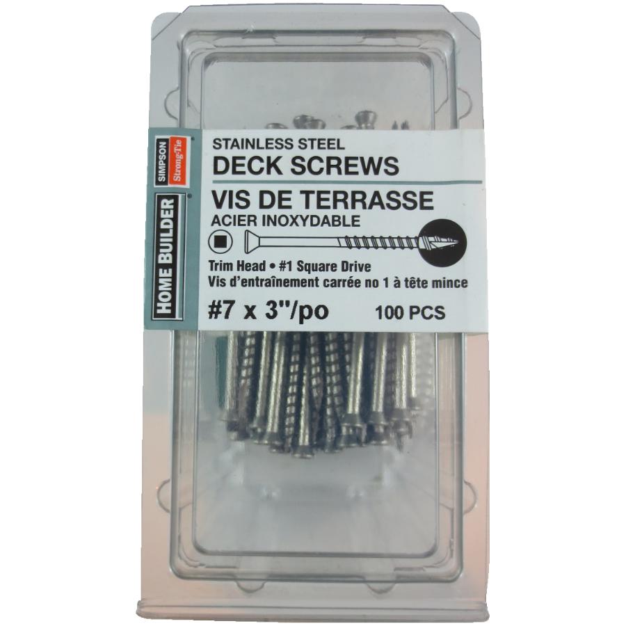 Colour Family: N/A Assembled Product Length: 3" Fastener Drive Type: TORX Finish: STAINLESS STEEL Fastener Diameter (Imperial): #7 Fastener Length (Imperial): 3" . Unique "box" thread design provides an increase in screw driving productivity • Specially-designed sharp point penetrates hard wood products with ease • 6-lobe drive helps prevent driver-bit cam-out, resulting in easier driving and longer bit life • Type 305 stainless steel for high level corrosion resistance - ideal for outdoor exposure and wet service environments such as decking, docks and boardwalks, finishing, millwork and trim • 100 pack