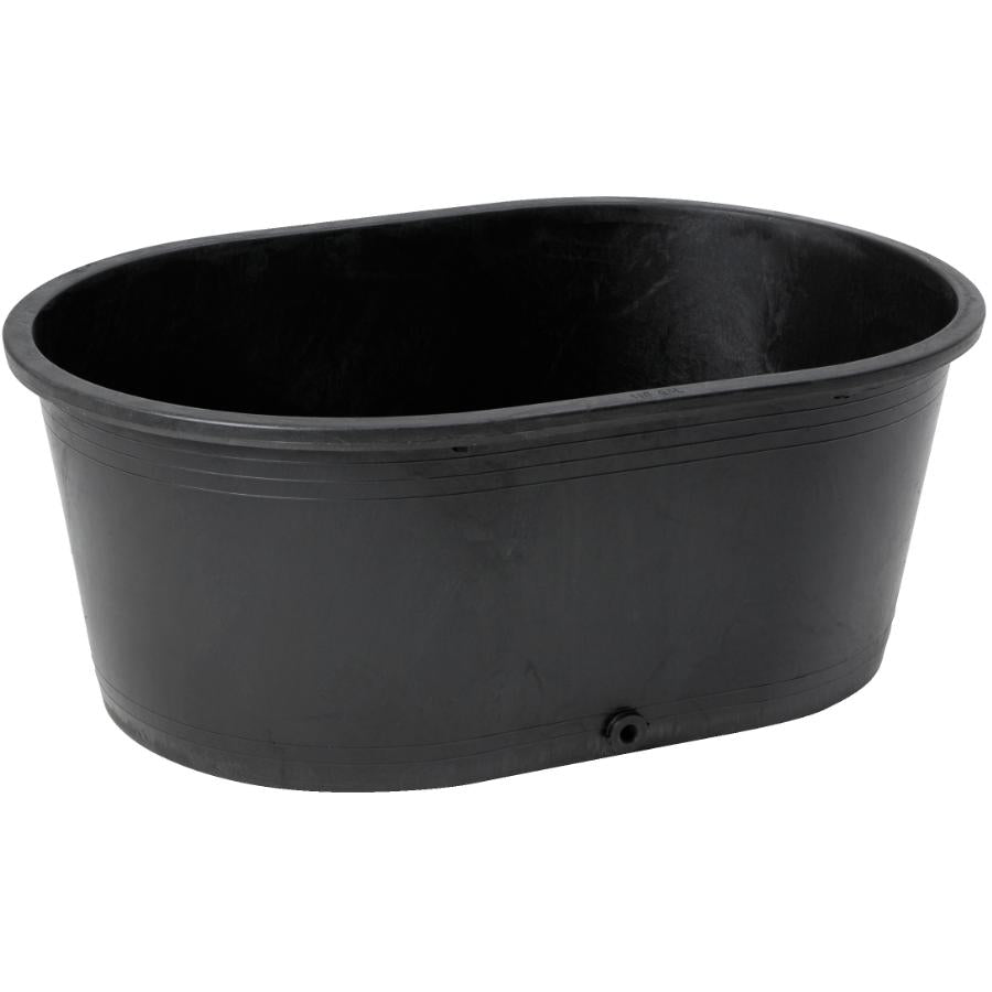 Made from heavy duty, impact resistant plastic, this 110 gallon oval tank with plug is heat & cold resistant, will not crack, U.V. resistant and chemically neutral to safely hold fertilizers, oil solvents, animal feeds, etc. It will hold heavy materials, will not rust, discolour or require maintenance and has smooth edges making it easy to handle and safe for animals. Measures 35" W x 54" L x 20" H.