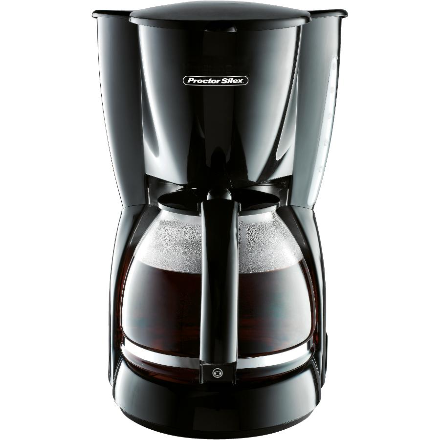 Brew a large pot of morning coffee using this Proctor Silex coffee maker. You can make 12 cups at a time to keep the coffee lovers in your household satisfied. The coffee maker has a removable cone-shaped brew basket and cone filter. The glass carafe has a heatproof handle. All are dishwasher safe. This unit has an illuminated On/Off switch, Auto Pause 'N Serve and a water window that shows the water level. The power cord stores neatly in the unit.