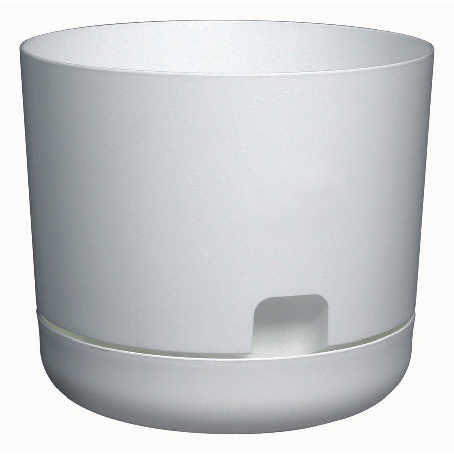 Show off your gardening skills with this timeless design self-watering planter, 12” (31 cm) in diameter by 10.5” (27 cm) tall, that allows you to monitor the volume of water in the saucer through the open view port. Water can be added at soil level or through this view port resulting in the perfect balance of water, air, and soil to ensure fast growth and healthy plants. With a mat finish and a soil capacity of 14.3 L, this planter is manufactured in Canada using recyclable, UV treated raw materials which are food safe. It can be placed either indoors or outdoors and it will allow your plants to grow to their max.