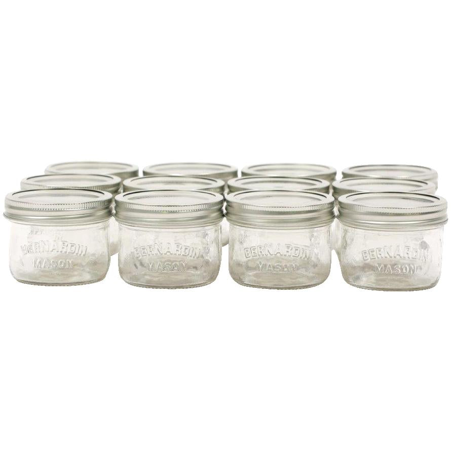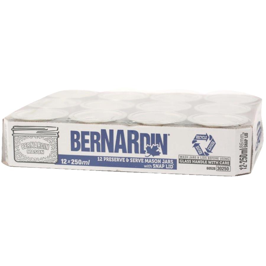 These 250 ml mason jars from Bernardin are ideal for home canning salmon, salsa, relish, chutney, jam, pickles and other specialties. The wide mouth allows for easy filling and transferring, and the low profile makes them almost impossible to tip over. Raised letters on the glass adds stylish accenting. Each box includes 12 jars, 12 snap lids and 12 decorative labels.