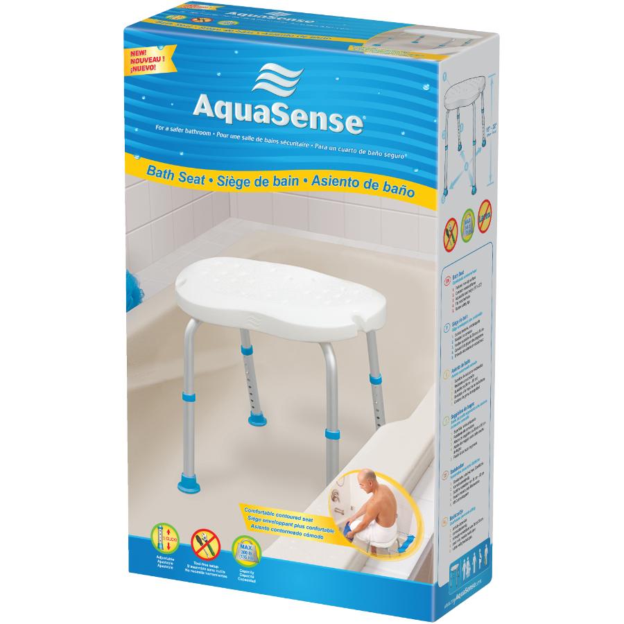 Bath seat with ergonomic shape, by AquaSense. Enjoy your bath or your shower seated on your ergonomic adjustable bath seat, by AquaSense, a bath seat with a comfortable contoured seat! These contoured adjustable bath seats without back feature a textured surface, drainage holes, seat handles, and slip resistant rubber safety tips. Adjustable legs raise or lower the seat height.