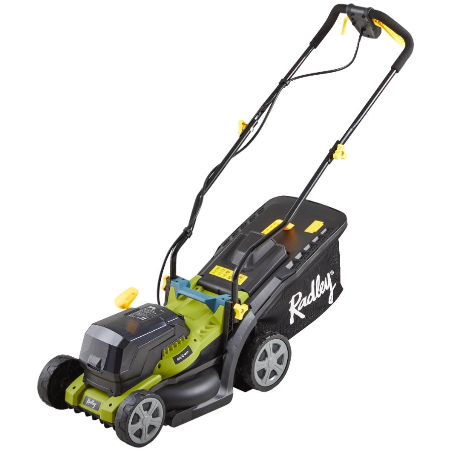 This Radley 14.5" 40V Max lawnmower is powered by (2) 20-Volt 4 Ah Lithium-Ion batteries so you can start mowing with the push of a button- instead of hassles with extension cords or spilling gas and oil. Select your ideal grass height from 1-1/8" - 3-1/8" with the 6-position single point height adjusent. The compact design features a sleek 14.5" deck, idea for small and medium sized urban lots. The collapsible handles are ideal for storage in tight spaces. The 20V 4Ah Lithium-Ion batteries (included) are adaptable to many other Radley cordless power tools and outdoor products (sold separately).