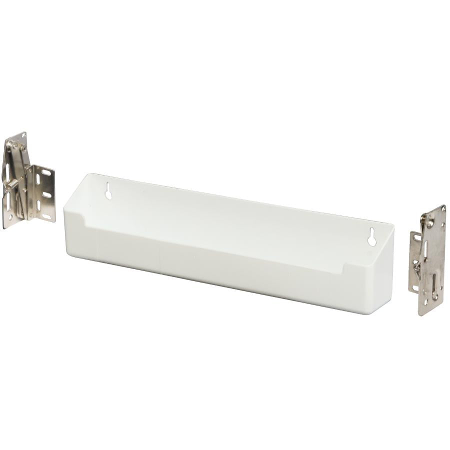 Colour Family: WHITE Material: PLASTIC Assembled Product Length: 2" Assembled Product Height: 3.75" Assembled Product Width: 14.75" . Front Sink Tray • 14" • One white plastic sink front tray • Set of scissor hinges and screws included • Min. interior drawer dimensions: 14-3/4" W x 2" D x 3-3/4" H