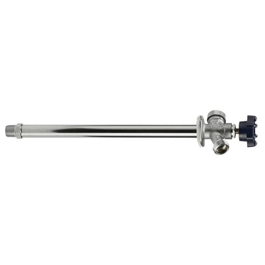 Protect your potable water supply with this 16" frost proof wall faucet. It keeps water free of contamination from back siphonage or backflow pressure. You can rely on the chrome construction for lasting durability. To prevent winter water-line freeze-ups, install this frost-free faucet with a slight downward pitch. The downward pitch ensures any water left in the faucet drains out through the water spigot. Don't forget to detach hoses in winter. When left attached, water may become trapped and cause the faucet to freeze and burst.