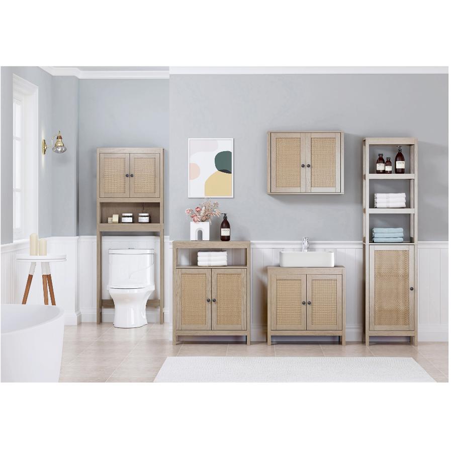 This storage cabinet with its slim silhouette stands tall and proud while providing the extra storage space needed in your bathroom or any space. The 3 open shelves are perfect for storing candles or rolled up towels, while the door offers out of sight storage for your toiletries and bathroom items. Sized to 16” x 12” x 63” and made to maximize your space with style. The smooth wooden finish and the durable MDF wood design will complement your space for a long time.