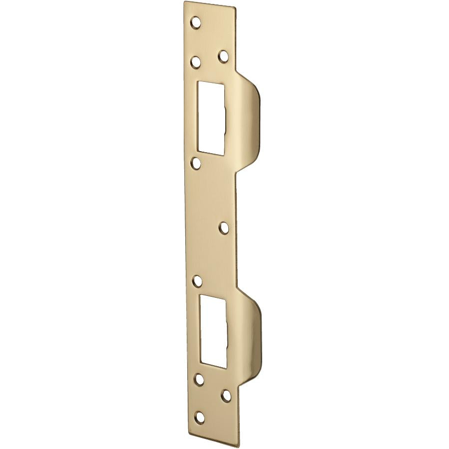 Finish: BRASS Assembled Product Height: 11" Assembled Product Width: 1.63" . Brass Replaces standard latch and deadbolt strikes Used with combination lockset and deadbolt installation on 5-1/2" or 6" hole centers Includes 3" long wood screws