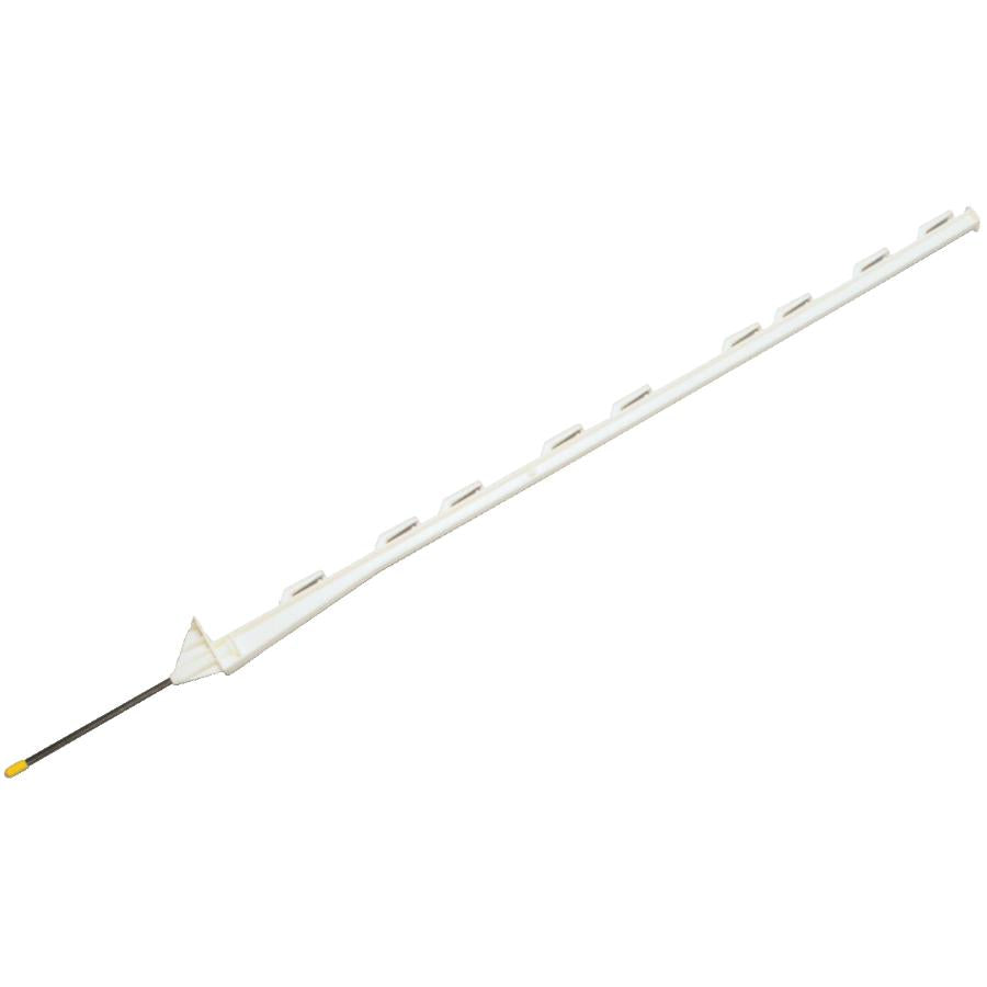 Colour Family: WHITE Material: POLYMER Size: 48" Assembled Product Length: 48" . Light weight non-conductive co-polymer poly construction 48" tall with a heavy duty 10" steel spike 9 insulators handle wire or tape up to 1-1/2" (40mm) wide Oversized step for easy installation White