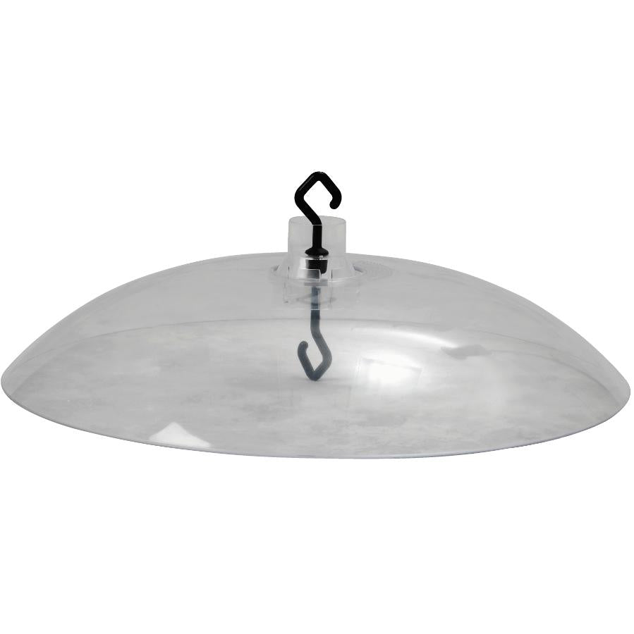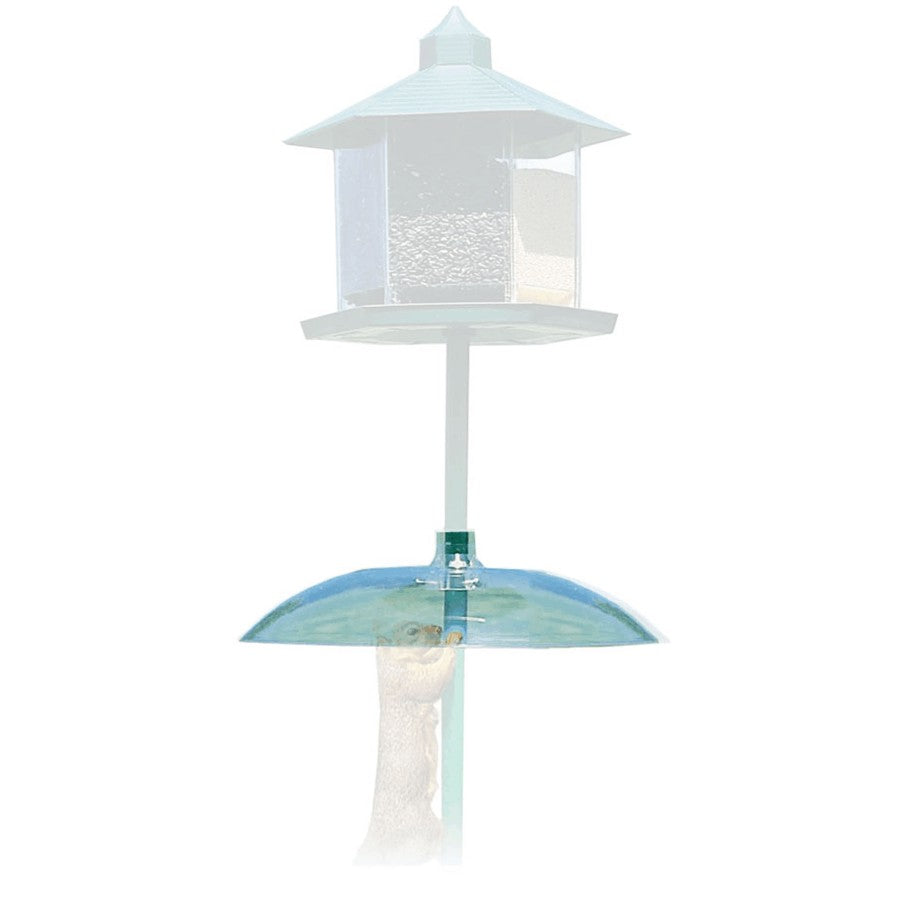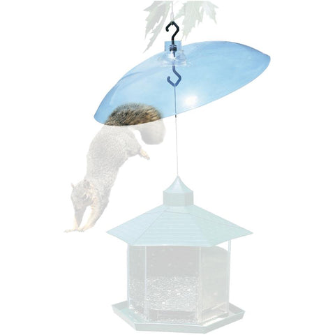 The Perky-Pet acrylic deluxe squirrel baffle can be hung or pole mounted. When hanging the baffle, it blocks squirrels from above. The included hooks have the strength to hold up to 12 pounds. The top hook attaches the baffle to a tree limb or other hanging location, while the bird feeder hangs from the second hook located underneath. Most squirrels will descend the wire to the baffle and give up. A more persistent squirrel may put its weight on the baffle in efforts to access the bird feeder below, but after climbing onto it, it will quickly tilt, sending the squirrel down to the ground (startled maybe, but uninjured). The hanging baffle has the added benefit of partially protecting bird seed from rain and tree debris.