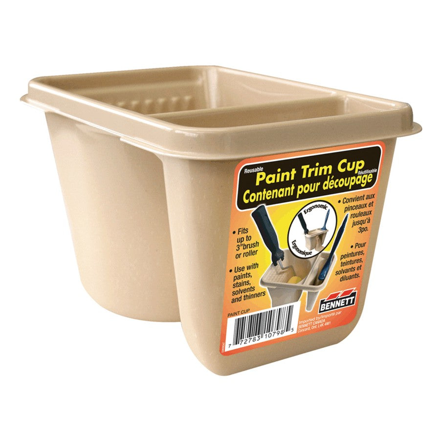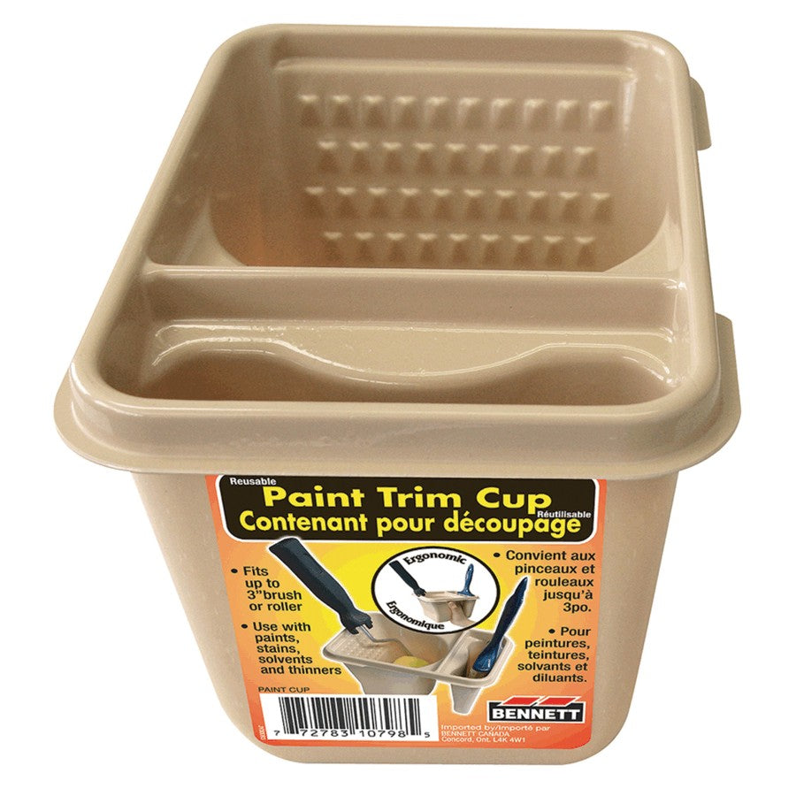 Plastic, reusable, ergonomic paint trip cup is easy to use. For small jobs and touch ups, take the paint cup in your hand and use either a 3” Roller or 3” paint brush to do the work. This paint trim cup can be used with paints, stains, solvents and thinners.