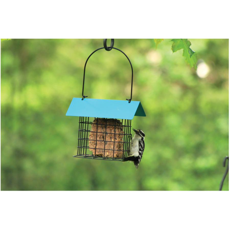 Add some colour to your backyard with this single suet cake feeder. The blue roof offers both vibrant colour in the backyard and protection of the suet cake. The perches offered are great for a wide variety of medium to smaller suet loving birds.