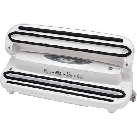 Keep leftovers as fresh and delicious as the day they were prepared. Features a removable drip tray, one-touch vacuum and seal button. The included Starter Kit contains three 1-quart bags, three 1-gallon bags and one 11"x10' roll.
