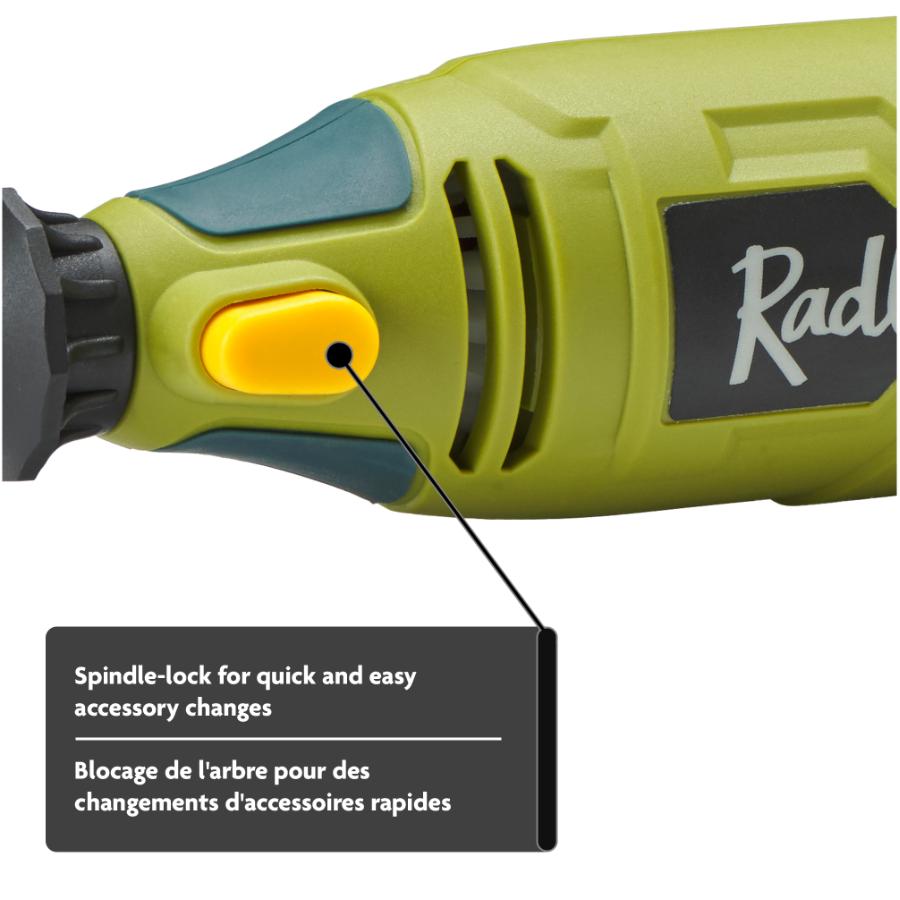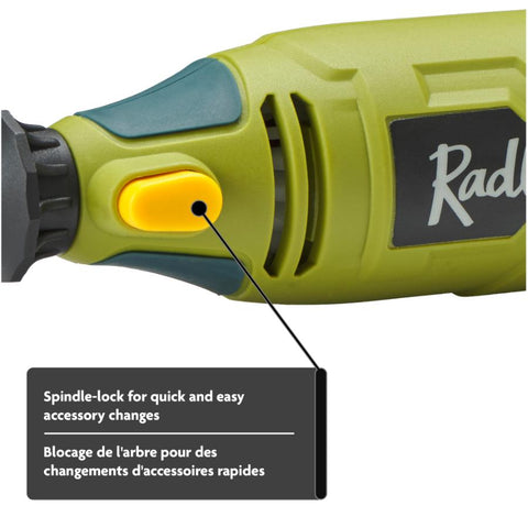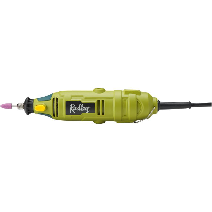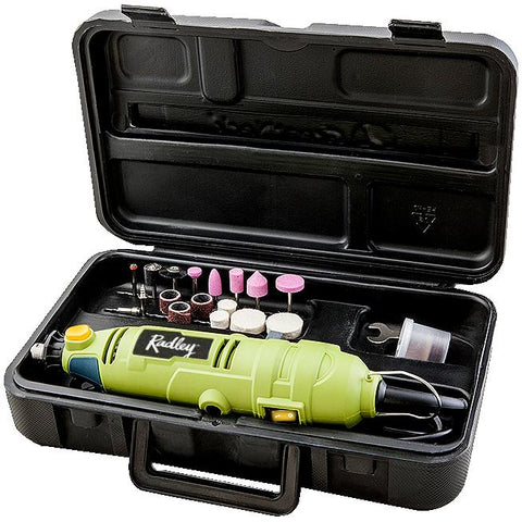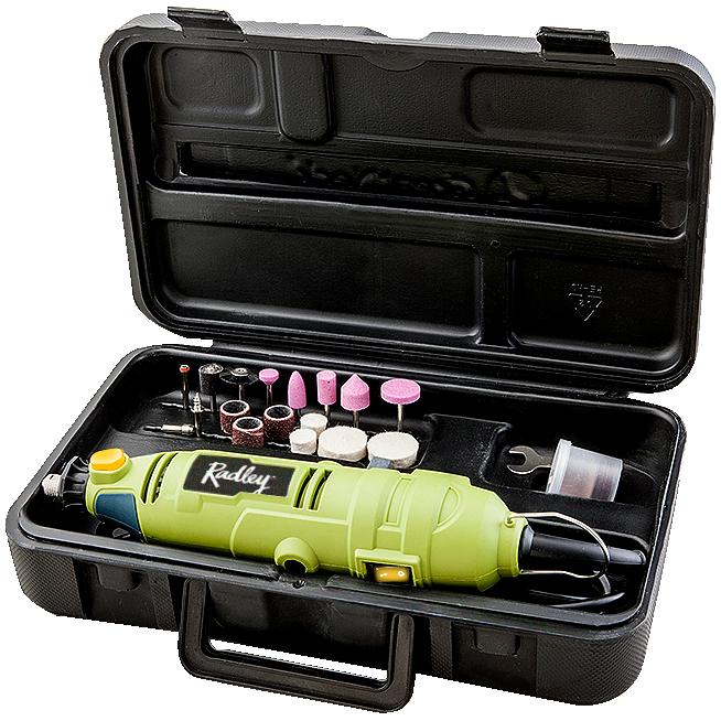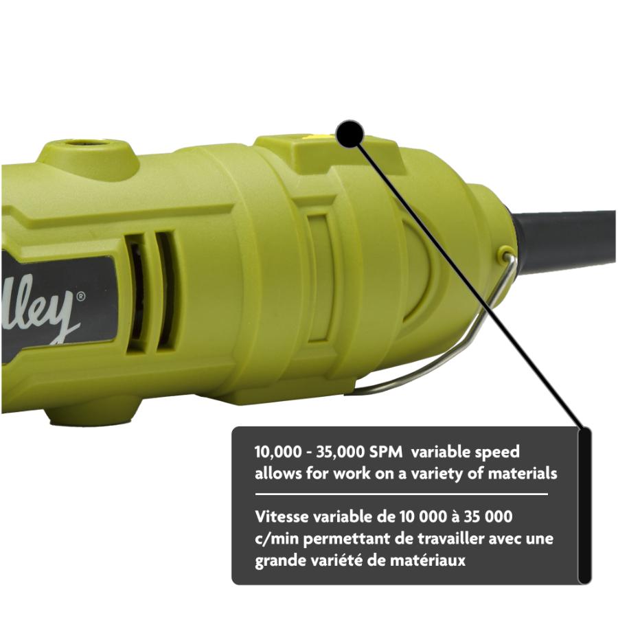 This variable speed rotary tool kit has a dial speed switch to easily changes speeds, a sliding on/off switch and a spindle lock for quick and easy accessory changes. The kit comes with 35 attachments that can be neatly stored in a handy case. It also has a 6’ power cord for increased maneuverability.