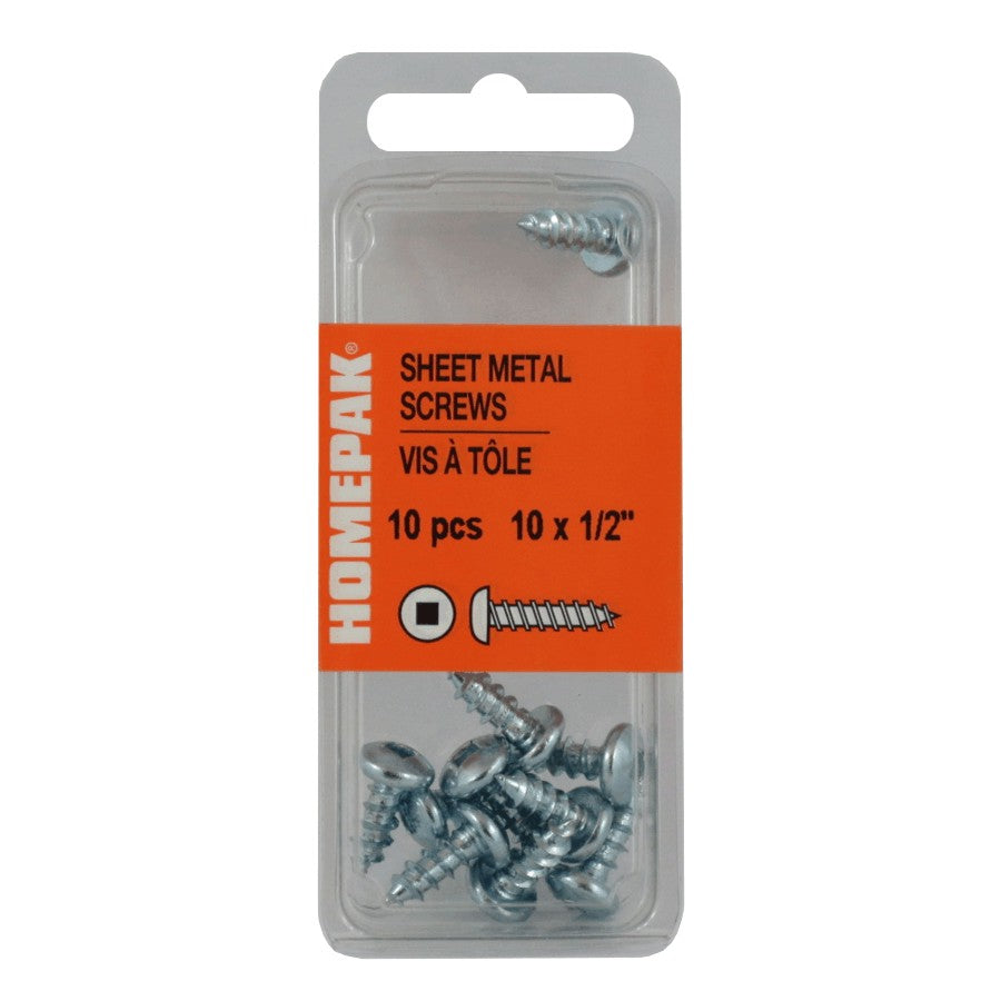 Material: STEEL Assembled Product Length: 0.5" Fastener Drive Type: ROBERTSON Finish: ZINC PLATED Fastener Diameter (Imperial): #10 Fastener Length (Imperial): 0.5" . Sheet metal screws • Pan head • Square socket drive • 10 pack
