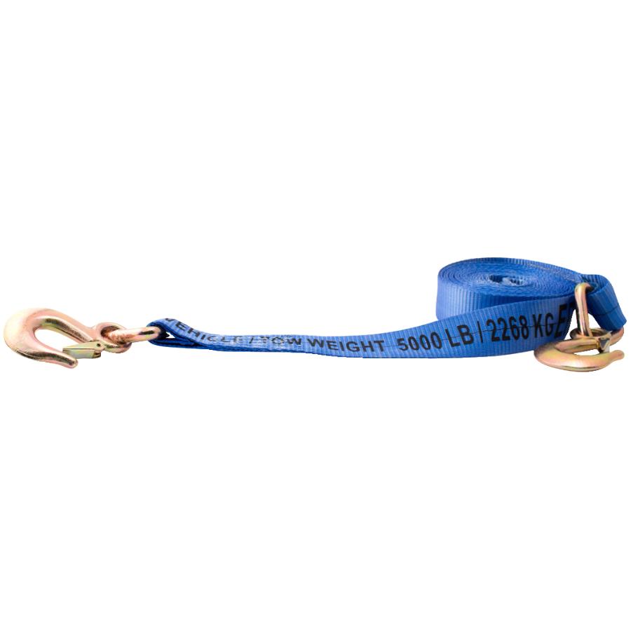 2' x 20' blue tow strap features forged safety snap hooks and a 10,000 pound breaking strength.