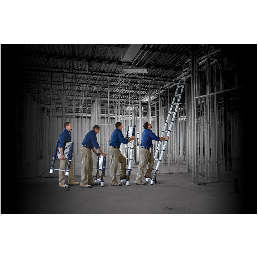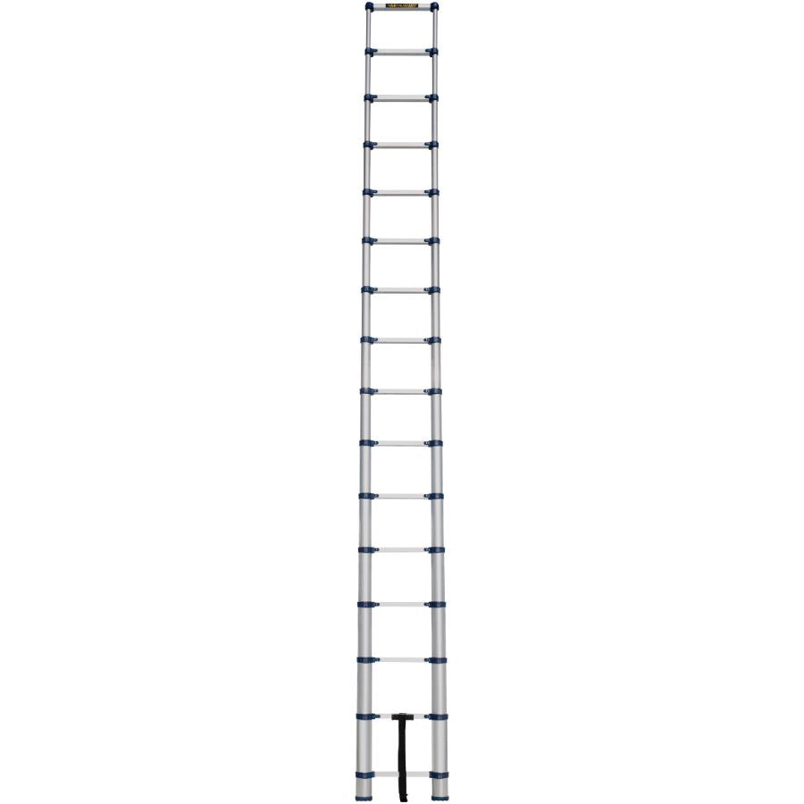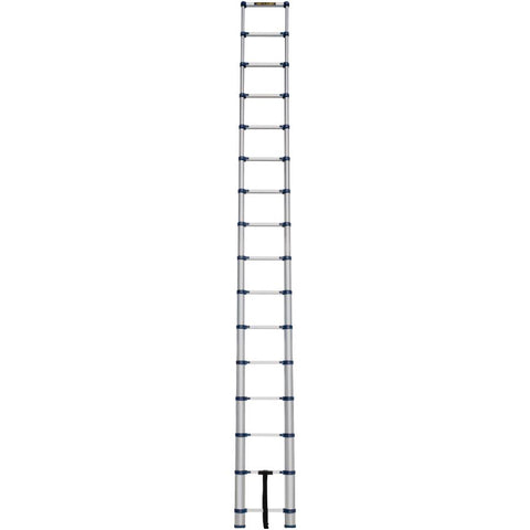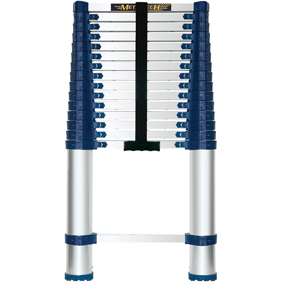 Here's a ladder that will go anywhere. This 15-1/2' MetalTech telescopic ladder extends in lockable 1' increments to the desired height. It has visible locking tabs to ensure safe operation; dark blue non marking end caps; compact size when collapsed makes it able to fit into small spaces (car trunk or closet); aluminum material and design makes it easy to carry; and comes with a hook and loop fastener strap to hold it in the closed position for easy carrying. With a weight of 40.5 pounds it is ideal for building inspectors, contractors, and homeowners alike who wants a compact ladder that is suitable for a variety of climbing applications.