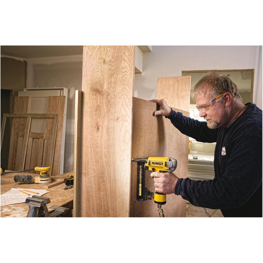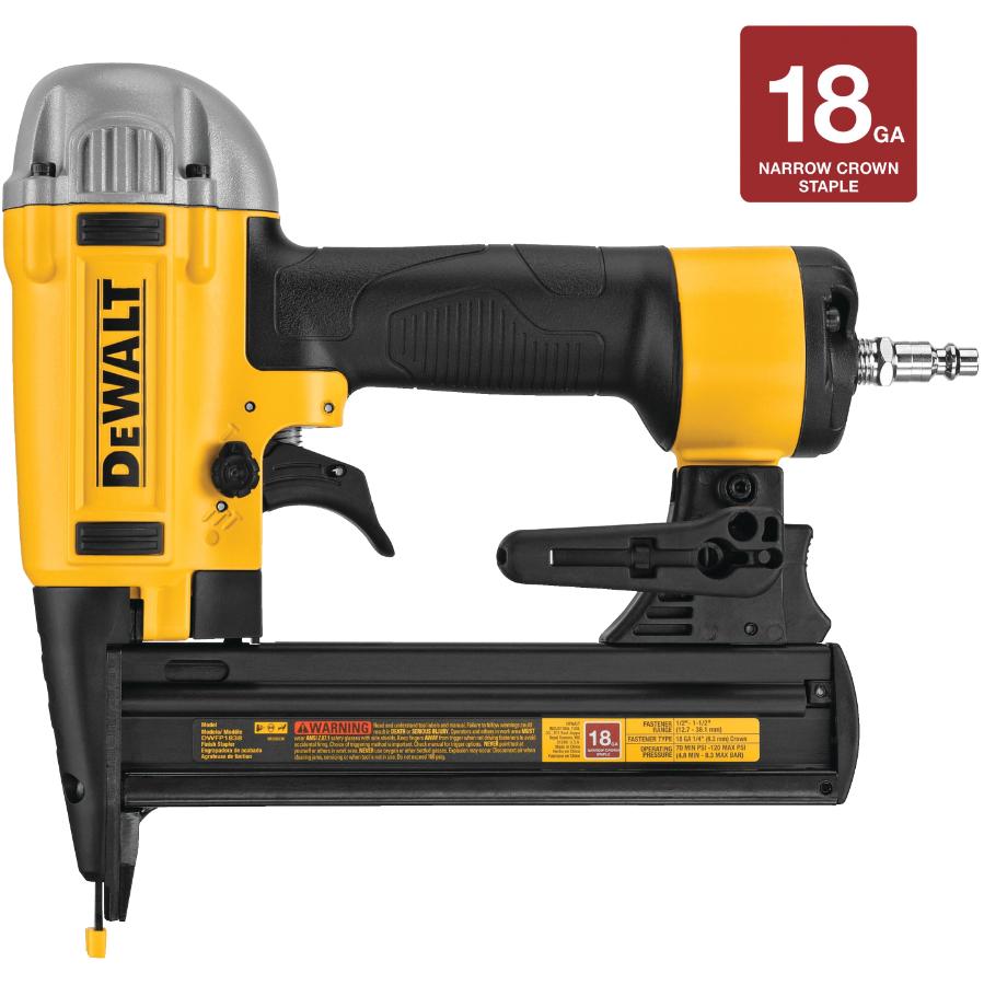DEWALT's 18-gauge Narrow Crown Stapler (model: DWFP1838) is ideal for most finish or trim nailing applications. Set precise countersinking depths with the tool-free depth adjusent system. This tool offers sequential or contact firing modes. This model's slim, cushioned grip provides improved user comfort and a sure grip during operation. The lightweight construction and design helps to reduce user fatigue during extended use.