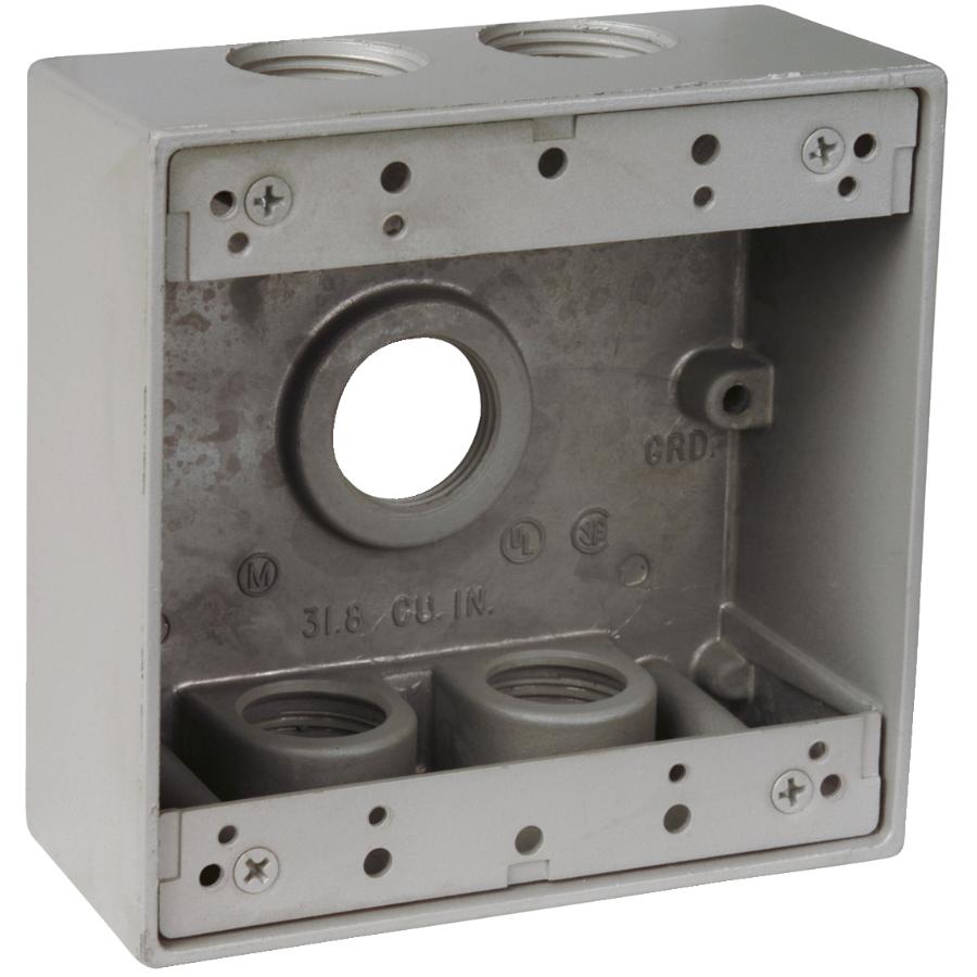 Shape: SQUARE . 2 gang universal weatherproof outdoor box 5 outlets with 2 on top and bottom and 1 on back, with ground screw Silver Aluminum 31.8 cubic inches DIMENSIONS: 3/4" hub size