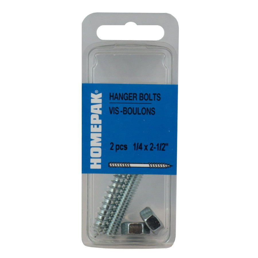 2 Pack 1/4" x 2-1/2" Zinc Plated Hanger Bolts, with Nuts