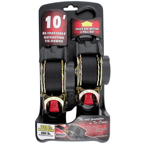 This 2 pack of 1" x 10' retractable ratchet straps feature vinyl coated "S" hooks. They are easy to use, just push the button to retract the webbing or unlock. The housing stores all excess webbing when not in use.