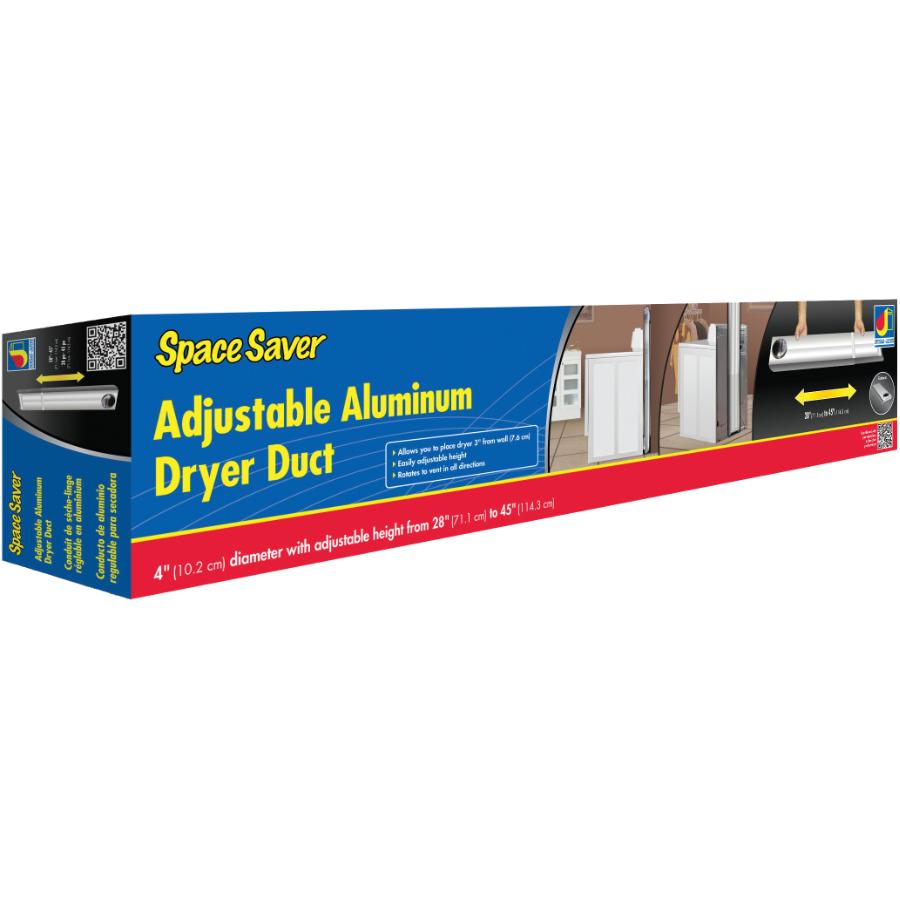 Material: ALUMINUM Assembled Product Height: 45" Diameter: 4" . Two piece adjustable aluminum duct Dryer can be installed 3" from wall 90 degree inlet/90 degree outlet extends 28" to 45" Hole diameter: 4"
