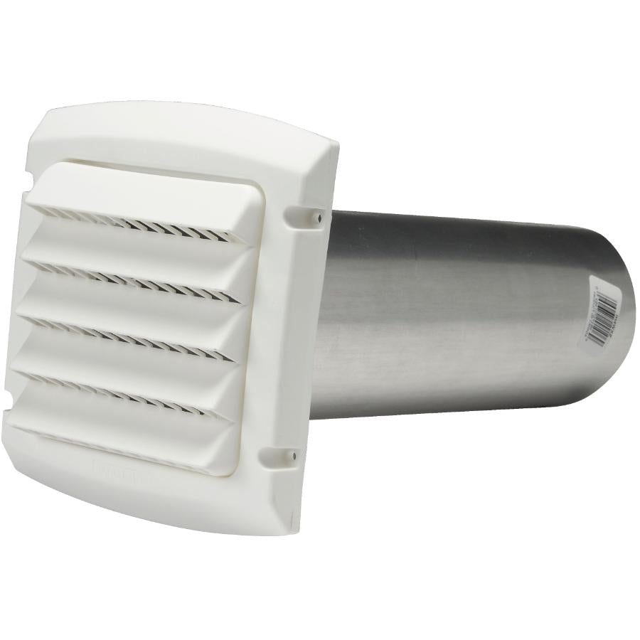 Material: ALUMINUM/PLASTIC Diameter: 4" . 4" intake cap and 4" diameter aluminum pipe UV resistant plastic Can be mounted on brick, concrete or siding J-channel flange sold separately to cap / hood, for use when installing on exterior siding up to 1" thick