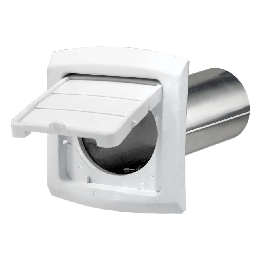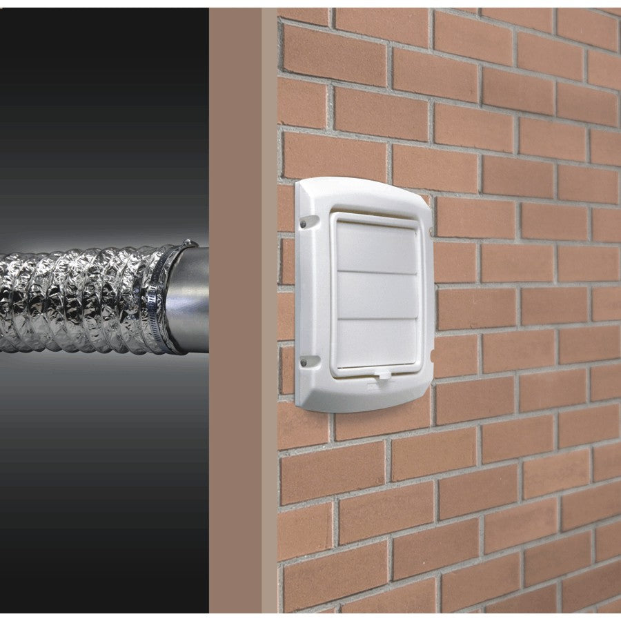 Colour Family: WHITE Material: METAL/PLASTIC Assembled Product Height: 4" Assembled Product Width: 4" Diameter: 4" . Hinged and louvered Cleaning your vent is now made easy UV resistant plastic 3 louver damper system prevents cold air, snow or rain from entering the home Locks in open position Easy removal of lint and debris No obstructions for a clear inspection for the duct Includes aluminum tailpiece