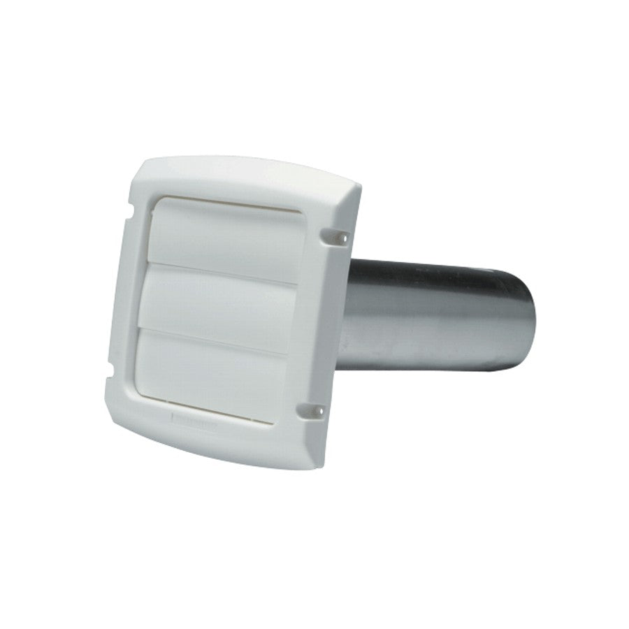 Colour Family: WHITE Material: METAL/PLASTIC Assembled Product Length: 1" Assembled Product Height: 4" Assembled Product Width: 4" Diameter: 4" . 4" louvered cap with 4" diameter aluminum pipe Installation instructions included Non-stick louvers UV resistant plastic Can be mounted on brick, concrete or siding J-channel flange sold separately to cap / hood, for use when installing on exterior siding up to 1" thick