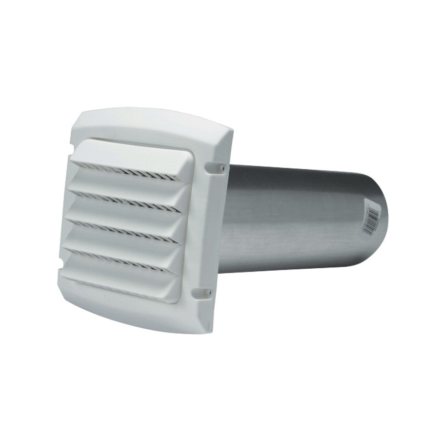 Material: ALUMINUM/PLASTIC Diameter: 5" . 5" intake cap and 5" diameter aluminum pipe UV resistant plastic Can be mounted on brick, concrete or siding J-channel flange sold separately to cap / hood, for use when installing on exterior siding up to 1" thick