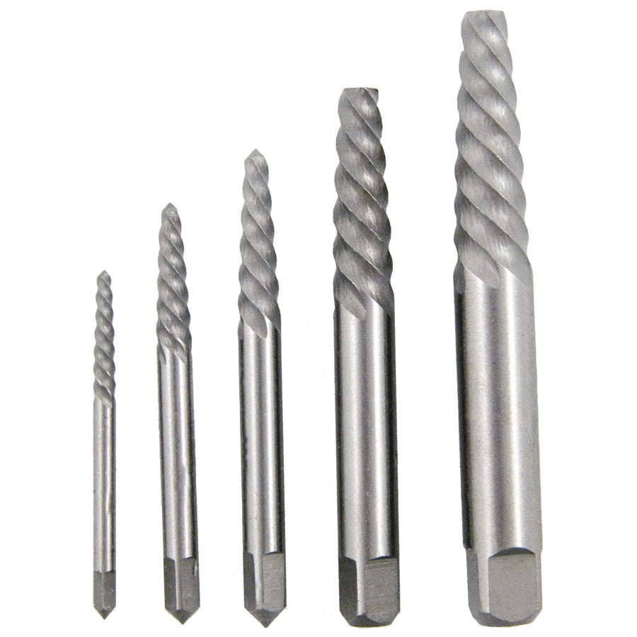 This set includes #1-5 extractors For removal of broken screws, pipes, bolts and studs quickly, and easily Tough, durable tool steel, heat treated Drill size permanently marked on shank of extractor High-quality spiral flute screw extractors For removing broken screws, bolts, and studs as well as pipe and fitting Tough carbon tool steel for long life