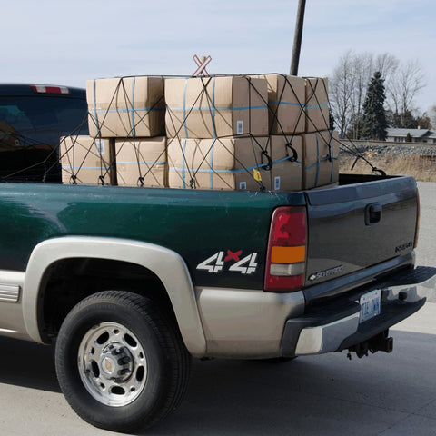 Our 72" x 96" bungee cargo net come in a zippered reusable bag. Made of 1/4" bungee with 32 polycarbonate hooks for securement. Designed to stop the tarp from blowing in the wind or light items or odd shaped loads.