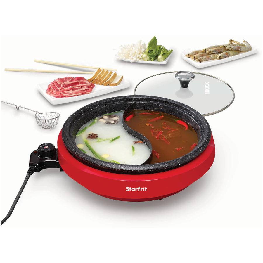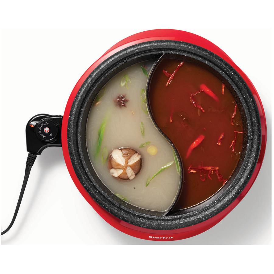 Starfrit the Rock Electric Dual-Sided hot pot is a safe alternative to traditional fondues that allow you to enjoy two delicious flavors of broths in one pot. The die-cast aluminium dual-sided pot is treated with our patented Rock.Tec surface treatment for an outstanding non-stick cooking surface that is three times better than traditional non-stick cookware. The adjustable temperature control helps monitor the heat to reach the perfect cooking temperature of your broth. The electric dual-sided hot pot is designed with a decorative cool touch base that makes a great table centrepiece and allows you to serve your guests safely without having to worry about hot surfaces. You can now enjoy your family and friends with piece of mind.