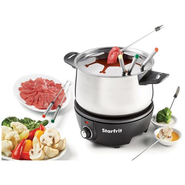 Your party will surely be a success with this 12-piece Starfrit Electric Fondue set - use it to prepare your favourite Chinese, cheese, or chocolate fondue. The adjustable temperature control helps monitor the heat for the perfect cooking temperature. An electric fondue is a safer alternative to traditional fondues that use gel fuel so you can entertain with safety in mind. The quick-release magnetic cord is designed for added safety to prevent dangerous spill-over - it detaches easily when cord is pulled on or accidently tripped over. The set includes 8 colour coded forks are included to avoid mixing and allow your guests to serve themselves without having to wait.