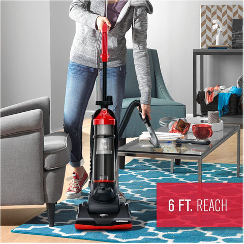 Weighing less than 9 pounds, the Dirt Devil(TM) Endura Lite Upright Vacuum can easily power through messes in-between furniture, under your bed and any other tight spaces. The three-stage Endura filtration system gives you a deep, effective clean for Advanced Performance with long-lasting, no loss of suction*. Plus, use the above floor cleaning hose and crevice tool to tackle debris on your coffee table and other above floor spaces. Wrap-up your clean with the touch of a button to empty your dirt cup while never touching the dirt again.