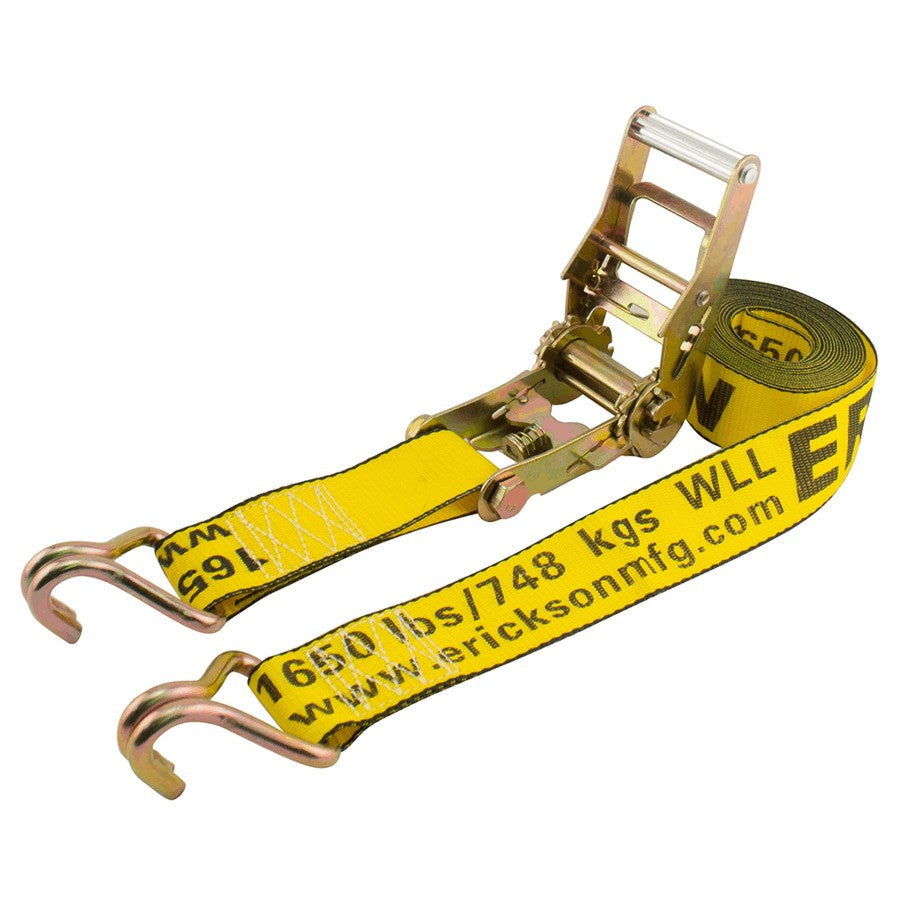 Our heavy duty 2" x 25' strap features double "J" hooks with a 1" opening and an aluminum handle ratchet. The strong 2" yellow webbing has a 1650 pound working load limit.