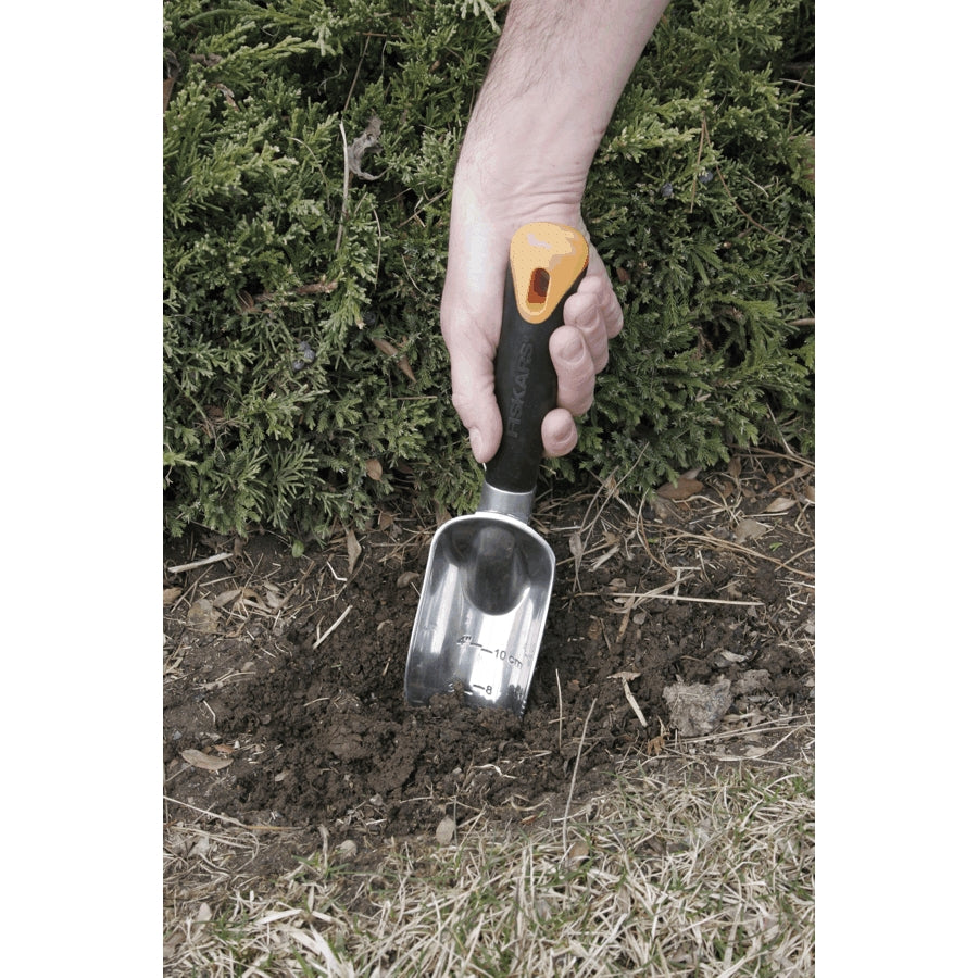 Fiskars Big Grip Transplanter reduces hand fatigue and makes transplanting easy and efficient. An extra-large handle with Softgrip provides excellent control and comfort, and gradation marks on the blade offer easy depth measurement. The cast-aluminum head resists rust and won't snap off while you're digging, and a sharpened blade edge makes it easy to dig into tough soil. Additionally, the handle features a hang hole for convenient storage.