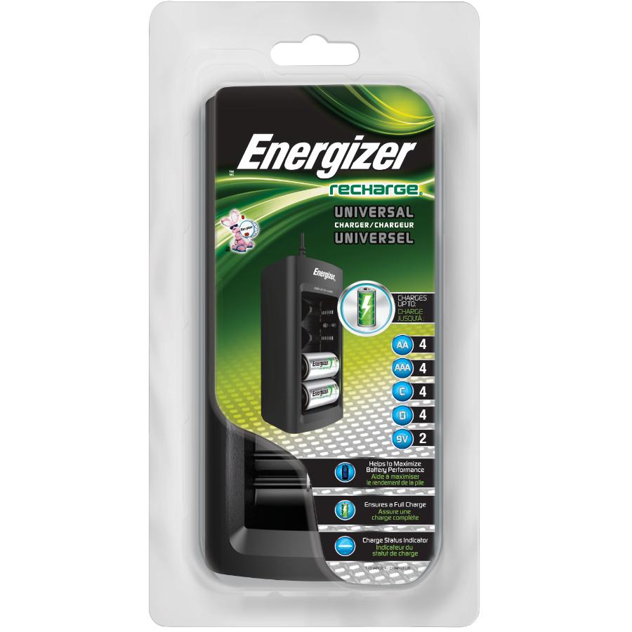 The easy way to keep ALL your rechargeable batteries juiced? The Energizer Universal Charger is designed for range, charging standard rechargeable battery sizes big and small—from AAA to 9V NiMH—without the need for multiple charging devices. Its LED light bar status indicator updates you in real time when charging is complete. Helps maximize battery performance; this charger automatically shuts power off to the circuit once it detects batteries are fully charged. With a multitude of safety features, like bad and primary battery detection, reverse polarity protection, and a timer that prevents overcharging—you get a reliable and worry-free charge time after time. So whenever a device runs out of juice, from game controllers to TV remotes to flashlights and toys, know you can trust the long-lasting performance and intuitive charging power of Energizer Recharge.