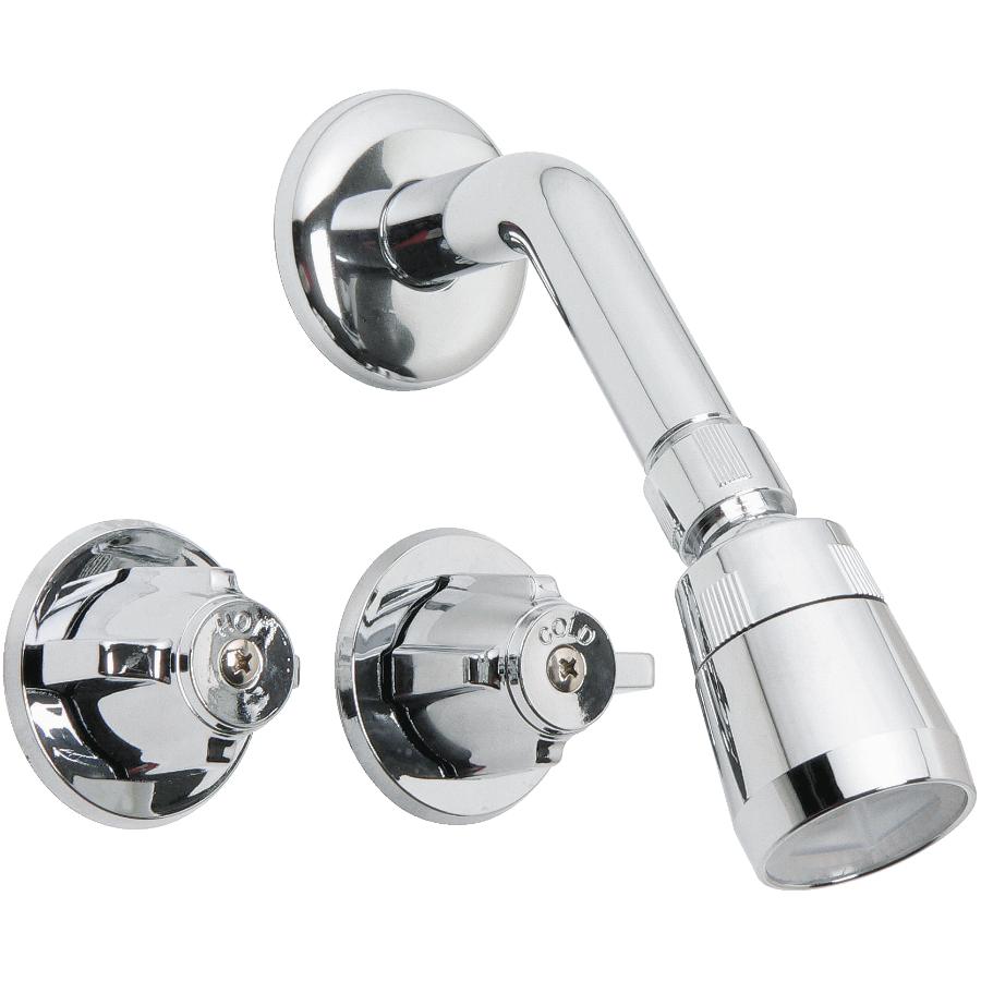 Discover this austere, wall mounted shower head and faucet set. The faucet features reversable mounting so it can be installed with pipes coming from above or below. The shower head has fully adjustable spray control that goes from a coarse spray to a gentle mist and has a swivel head to change direction of the spray.