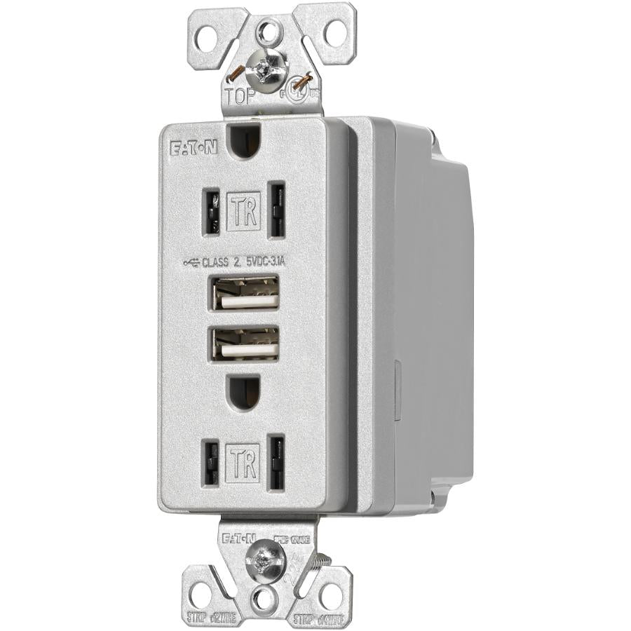 EATON TR7755SG-K-L Combination USB Charger with Tr Duplex Receptacle, Wire Leads, 12-14 Awg, 125 Vac, 15 A, Silver Granite